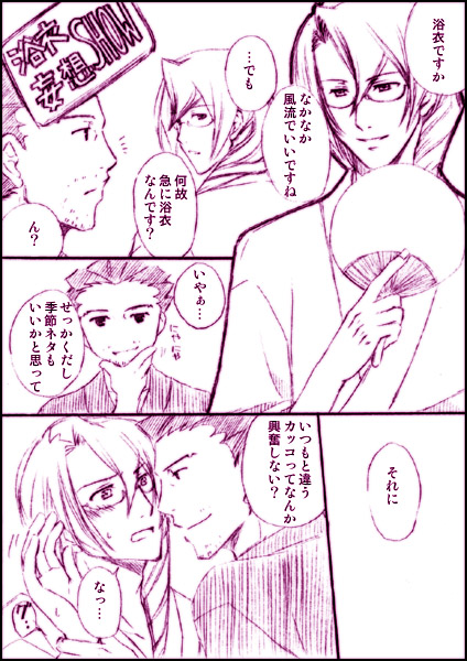 裁きの庭10で配布したペーパーに載せていた漫画です。 セリフだけ見難かったので打ちなおしました。 浴衣ネタを今夏描きたいとメモで言ってたのを実行。 そして成歩堂も妄想を実行すればいい。しかし成歩堂がただのエロオヤジに。 WEBにアップするにあたって霧人さんの乳首だけ塗りました。
